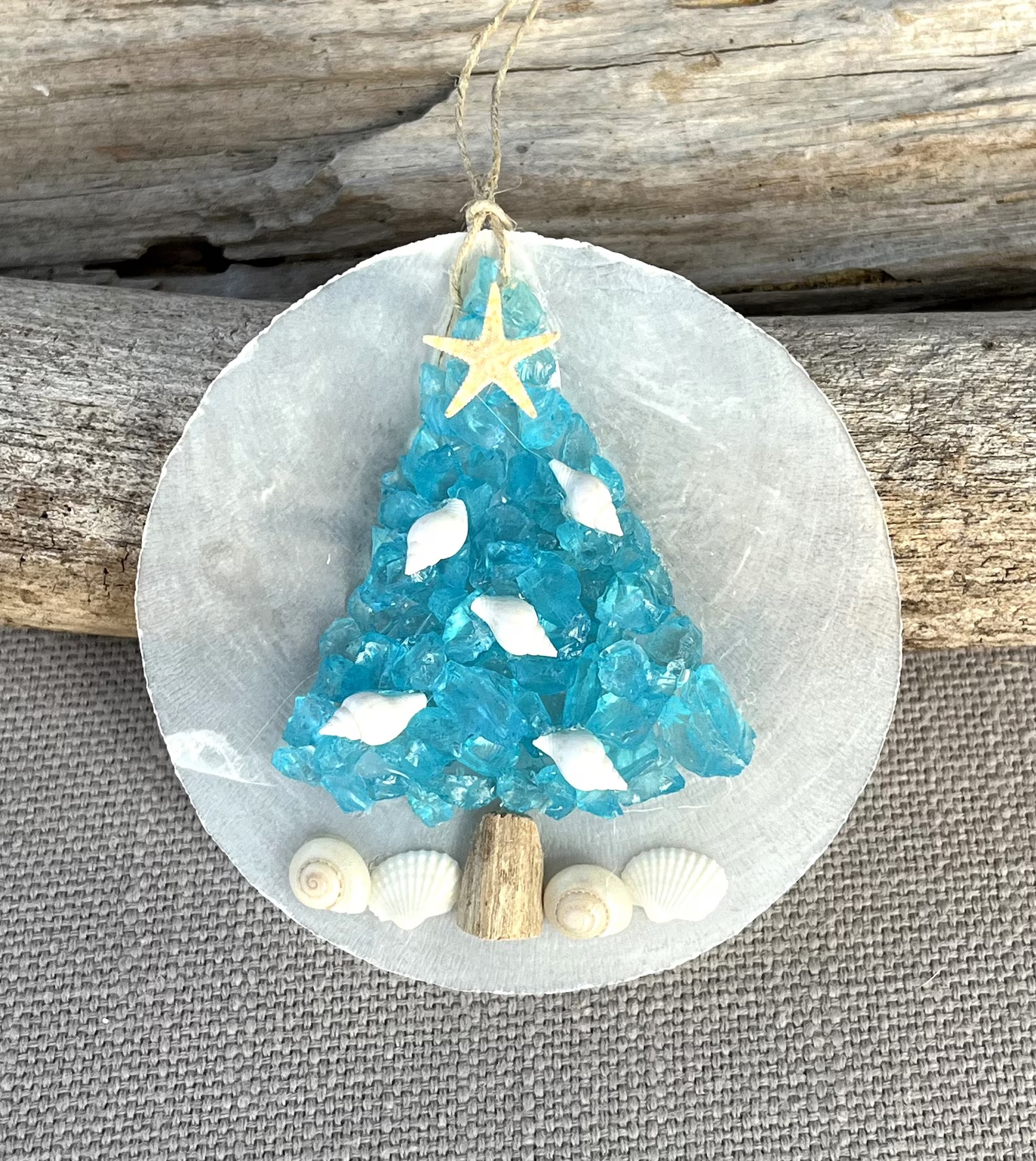 This stunning piece features ocean-blue “sea glass” pieces artfully arranged into a Christmas tree shape, adorned with miniature seashells and topped with a starfish. Resting on a bed of textured sand with small starfish accents, it captures the magic of a winter holiday with a refreshing beach twist.