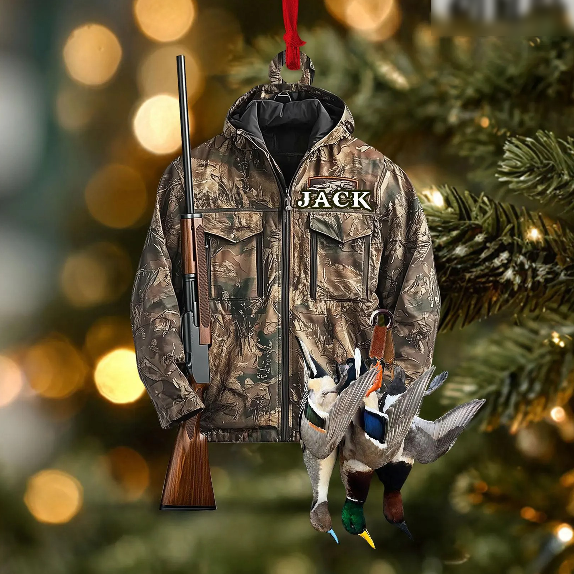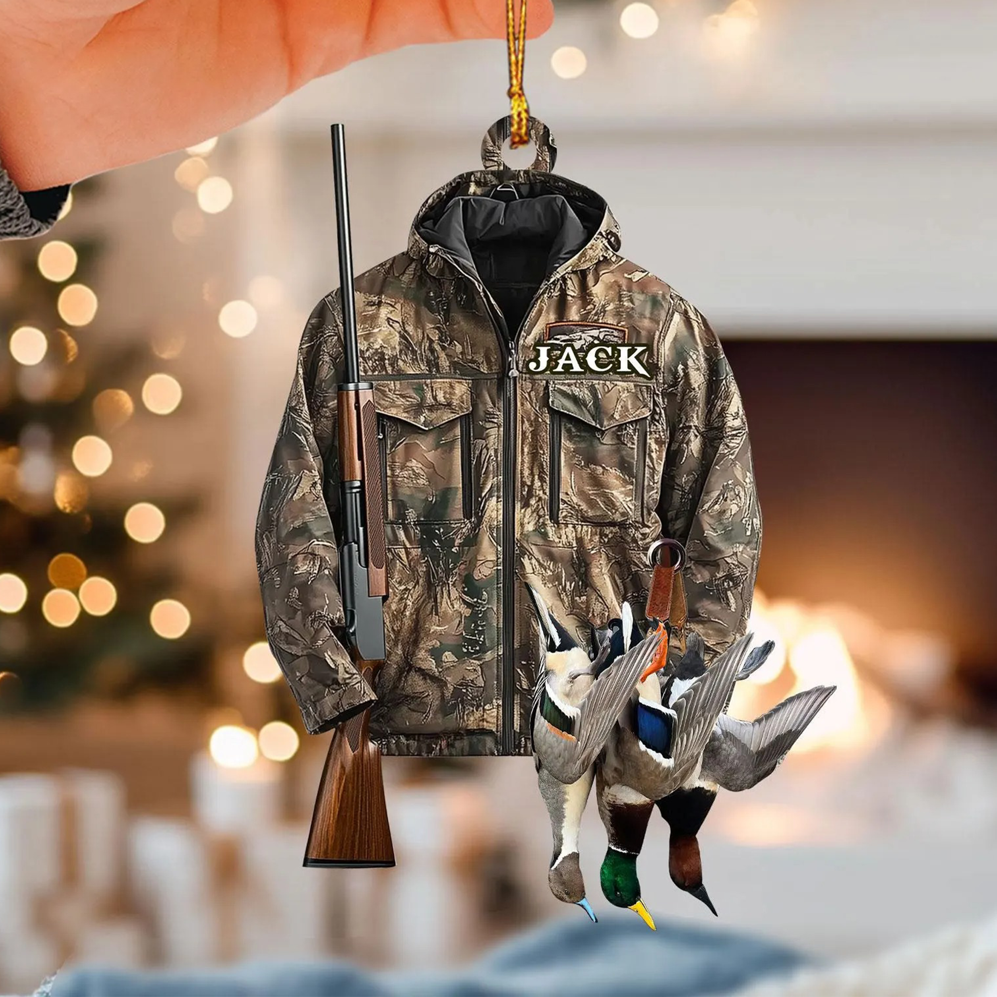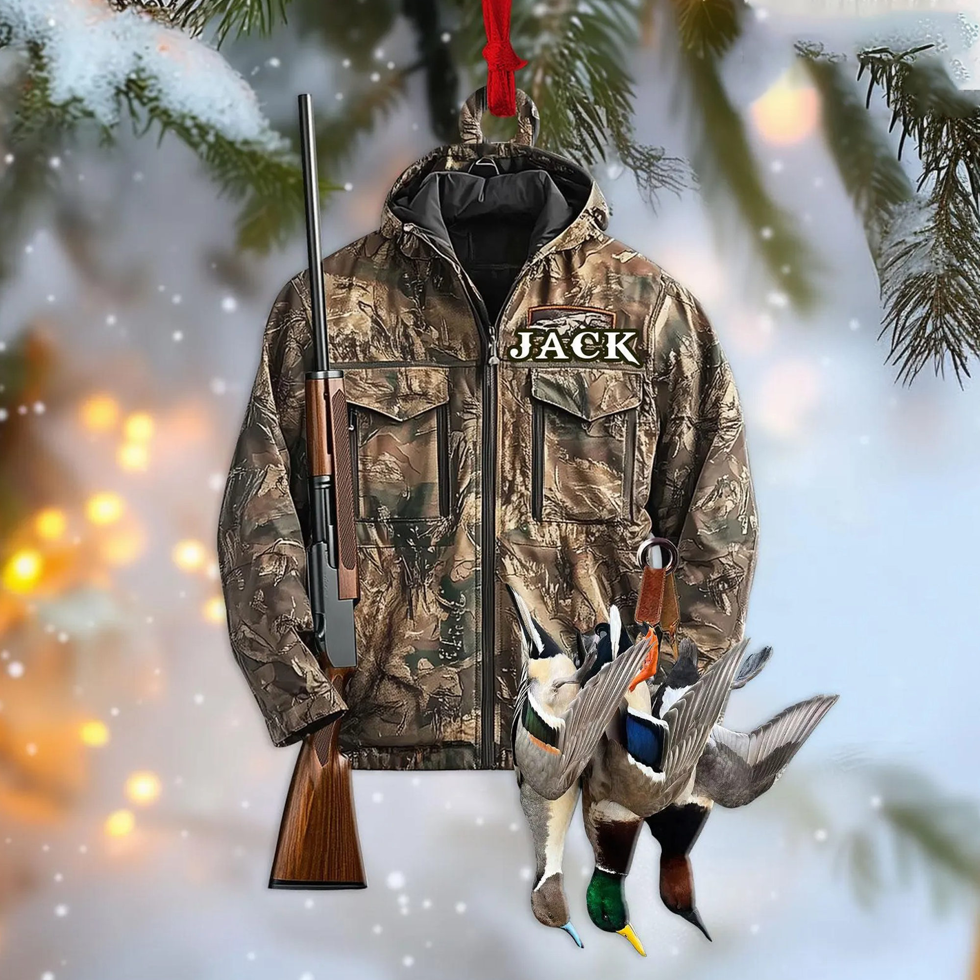 🎁Bring the warmth of the outdoors home this Christmas with our personalised hunting ornament. Perfect for nature lovers, this beautiful ornament features a camouflage jacket, a classic hunting rifle and several wild ducks, symbolising the joy of the hunt.